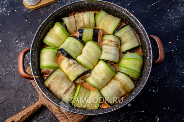 Таким образом поступите со всеми овощными полосками и начинкой. Выложите заготовки в сотейник на соус швом вниз.