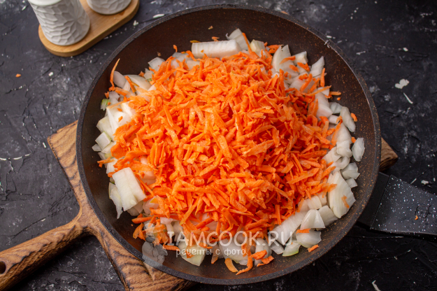 В то же время в сковороде обжарьте мелко нарезанный лук, добавьте морковь, натертую на терке, и готовьте еще пару минут - до мягкости.