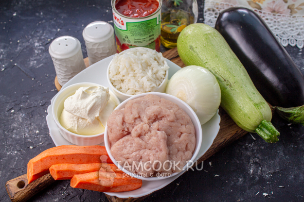 Соберите все необходимые продукты для приготовления фаршированных баклажанов и кабачков на сковороде.
