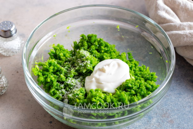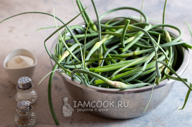 Для данного рецепта берите молодые стрелки. Собирайте до начала их цветения, скручивания или пожелтения. Майонез можно взять домашнего приготовления. Соль и чёрный перец, а также другие специи, добавляйте по своему вкусу.