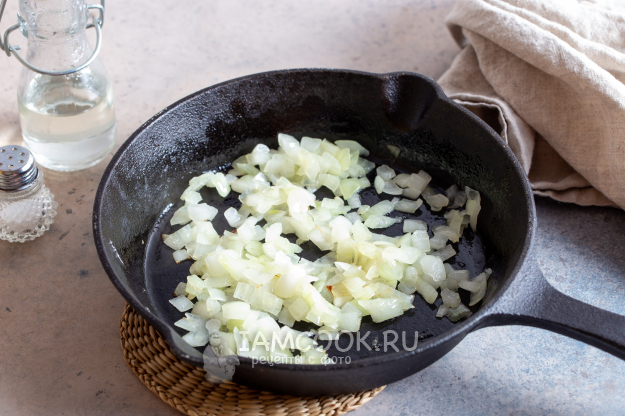 Репчатый лук очистите и порежьте кубиком. Сковороду с маслом разогрейте и на среднем огне обжарьте нарезанный лук до мягкости, несколько минут. Перемешивайте лук, не допуская его пригорания.