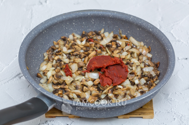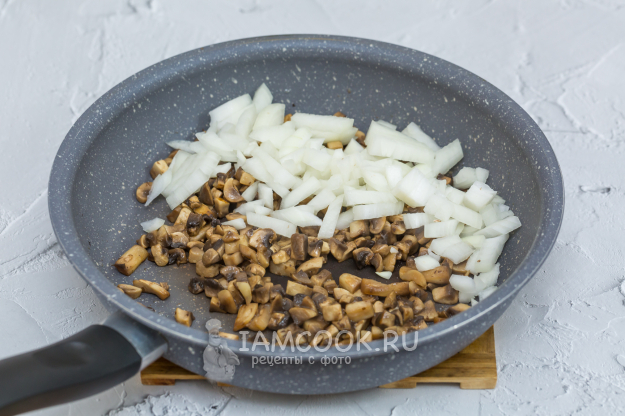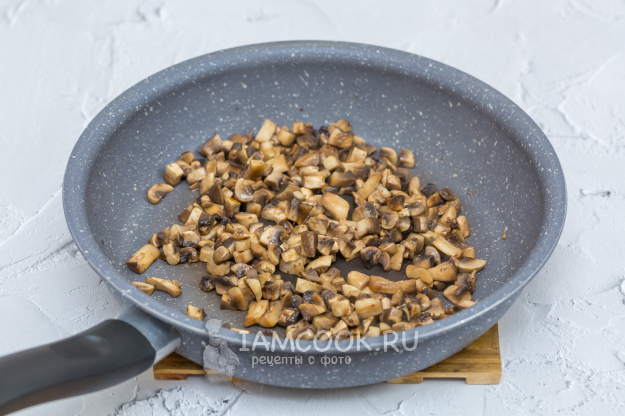 Грибы нарежьте мелко и обжарьте на сухой сковороде при сильном нагреве, помешивая, до полного испарения жидкости.