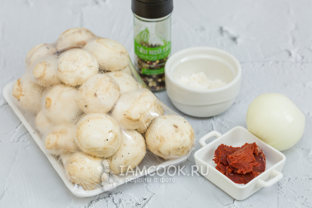 Для приготовления постной грибной подливы из шампиньонов подготовьте продукты по списку.