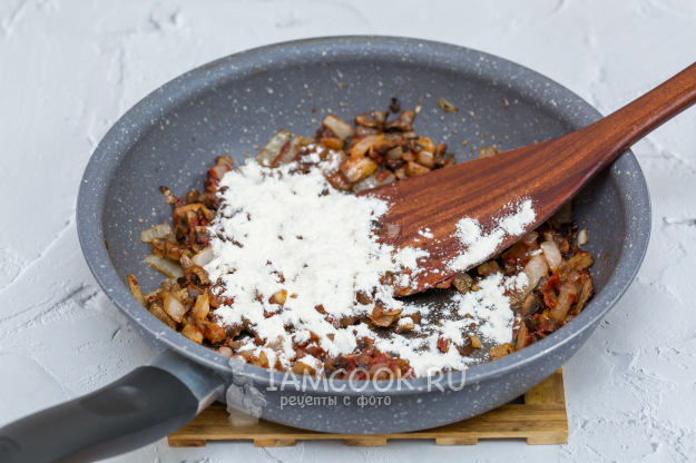 Затем добавьте муку, помешивая, жарьте около минуты, после чего добавьте воду и хорошо перемешайте.