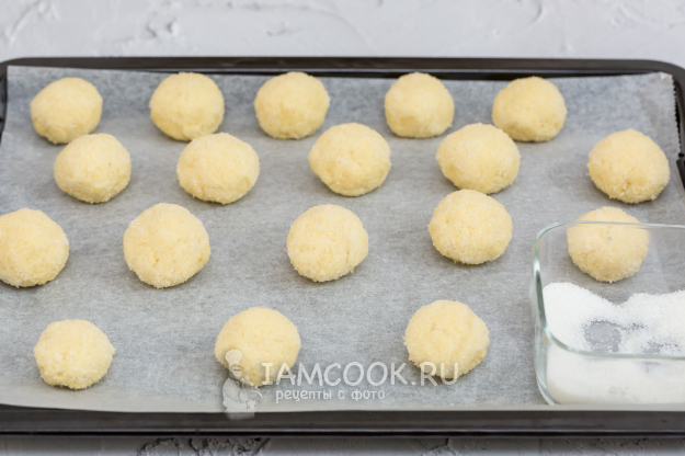 Каждую заготовку наполовину окуните в сахар и выложите на противень, застеленный пергаментом, сахарной стороной вверх.