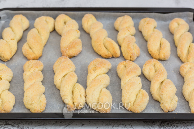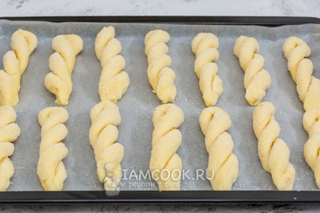 Каждую заготовку окуните в сахар и выложите на противень, застеленный пергаментом.