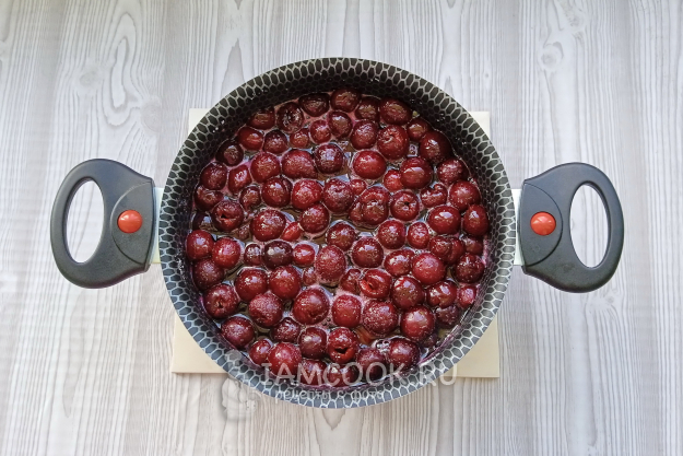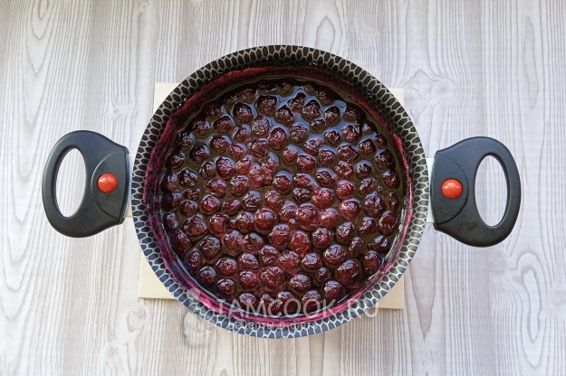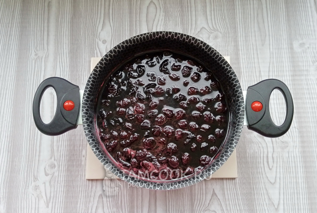 Поставьте кастрюлю на плиту. Доведите до кипения вишню с соком и варите на огне чуть ниже среднего 20 минут. После снимите пену. Дайте варенью постоять 2-3 часа.