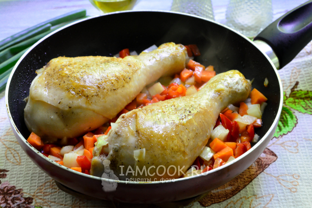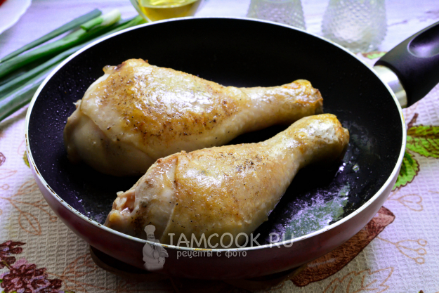 Разогрейте растительное масло на сковороде, выложите куриные голени и обжаривайте на среднем огне 5-7 минут с двух сторон, чтобы подрумянились.