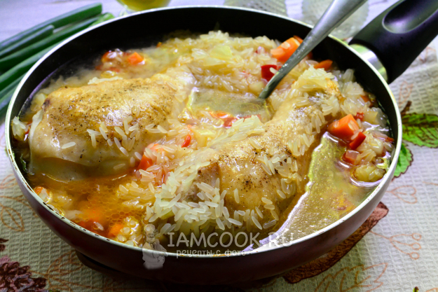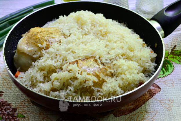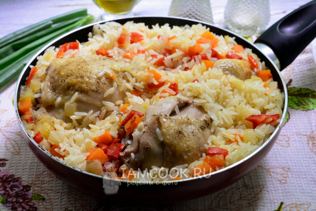 Возьмите ингредиенты для приготовления куриных ножек с рисом на сковороде.