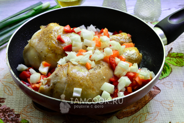 Пассеруйте овощи с куриными голенями пару минут, чтобы лук, морковь и перец стали мягче и выделили сок.