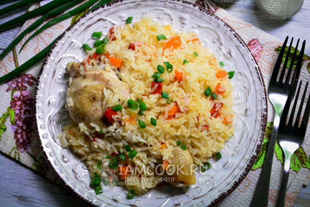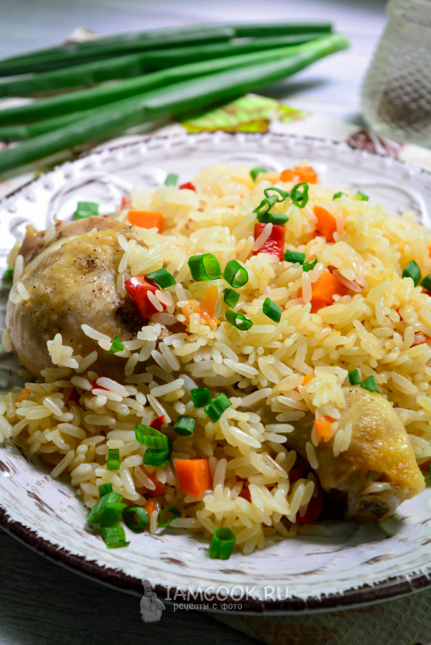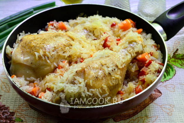 Готовьте куриные голени с рисом на сковороде под крышкой на медленном огне 30 минут, пока не выпарится вся жидкость. Рис будет рассыпчатым, а мясо станет полностью мягким.