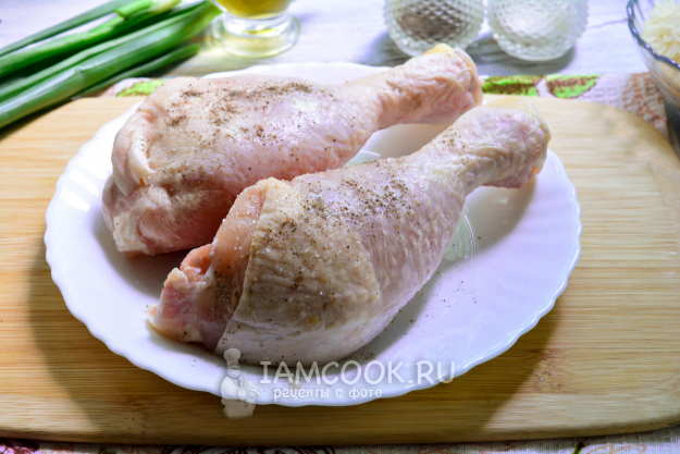 Куриные голени промойте, натрите солью и черным молотым перцем.