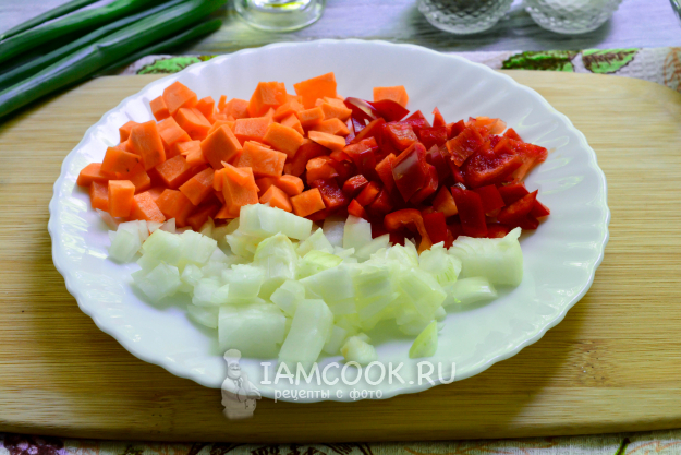 Все очищенные овощи нарежьте кубиками - морковь, сладкий перец и репчатый лук.