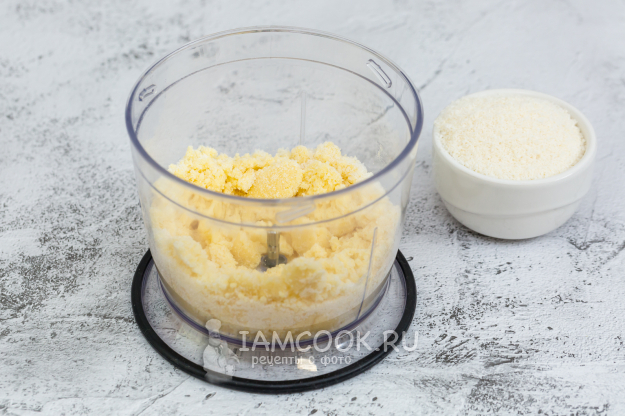 Если будете делать в блендере, как я, то смешайте муку, сахар, масло, перетрите в крошку, а затем добавьте стружку и перемешайте.