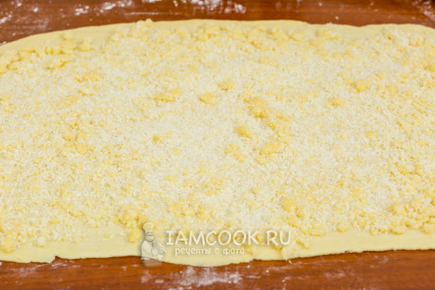 По длинной стороне сверните тесто в плотный рулет, пройдитесь по нему скалкой, слегка придавливая.
