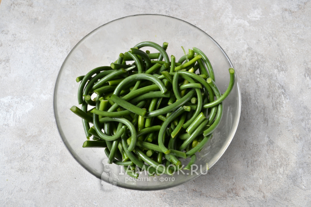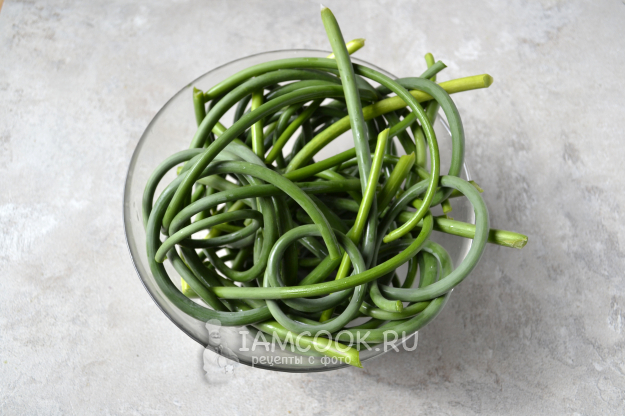 Чесночные стрелки промойте и отрежьте цветоносы.