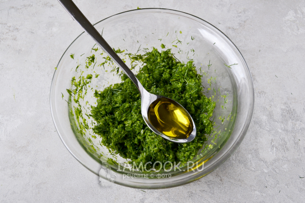 Перемешайте, чтобы получилась однородная масса, и влейте оливковое масло.