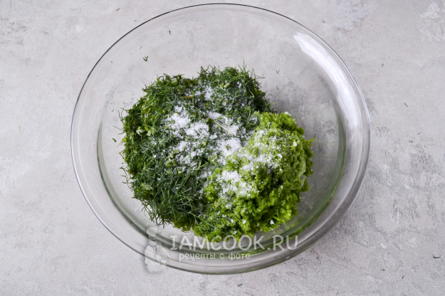 В миску с измельченными стрелками положите нарезанный укроп, посолите.