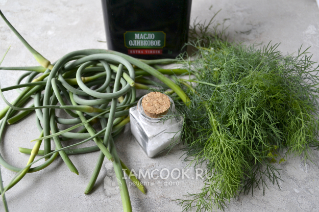 Для заготовки (заморозки) чесночных стрелок с укропом на зиму возьмите молодые, мягкие стрелки чеснока и укроп, крупную соль и оливковое масло.