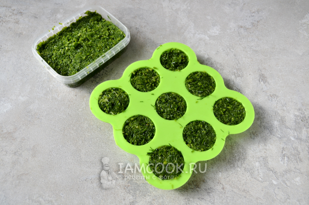 Для заморозки можно использовать небольшие пластиковые контейнеры или силиконовые формочки. Плотно заполните чесночной массой формочки и поставьте в морозильную камеру.