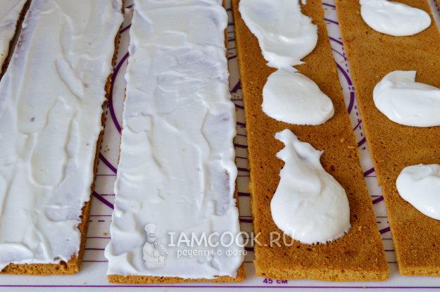 Коржи выложить на рабочую поверхность нижней стороной вверх. Распределить по ним крем (немного отложить для верха и боков). Оставить для пропитки на 1-2 часа.