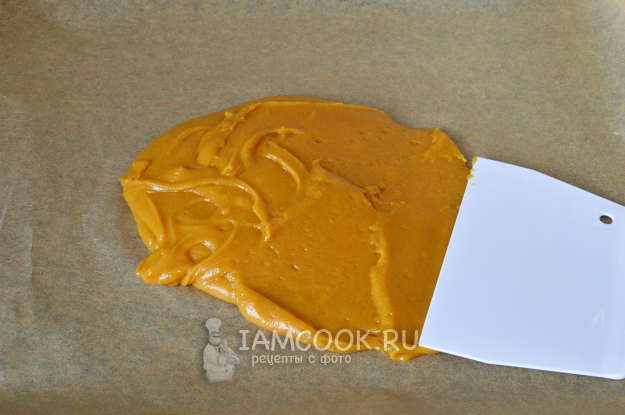 Противень застелить пергаментом. Тесто разделить на две равные части. Одну часть выложить на противень и разровнять шпателем или другим удобным инструментом.