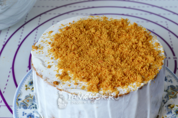 После пропитки покрыть торт отложенным кремом и посыпать крошкой.