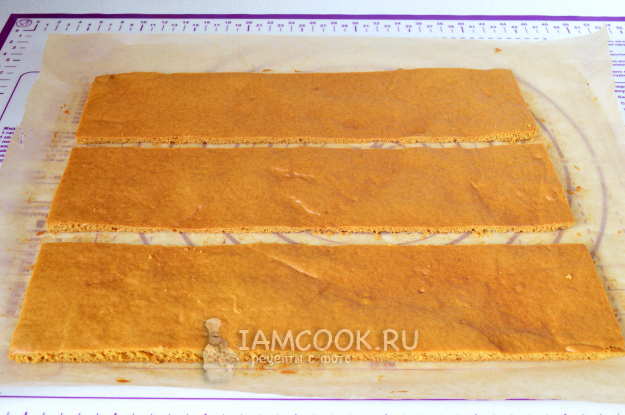 Выпечь корж в разогретой до 180°С духовке около 7-8 минут, до золотистого цвета. Главное - не перепечь! Готовый корж сразу же подровнять по краям (обрезки оставить для украшения) и разделить на три равные части.