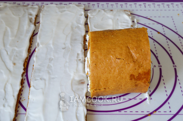Собрать торт. Начиная с одной полоски, свернуть рулет, постепенно подставляя следующую.