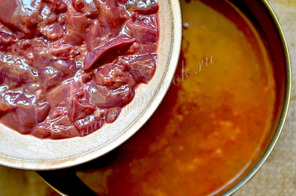 Когда фасоль в супе будет почти готова, добавьте печень. Посолите и варите ещё 20 минут.
