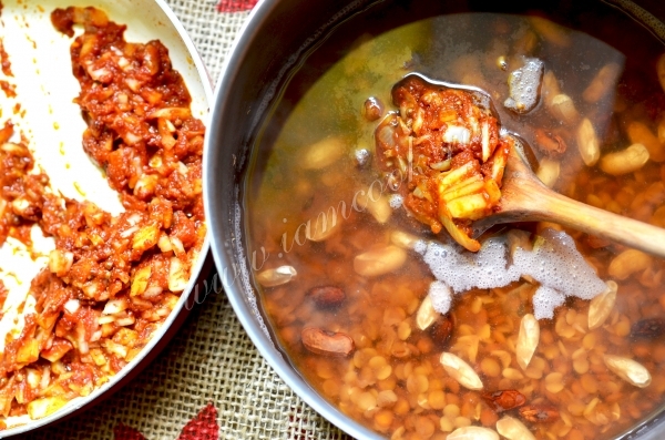 Зажарку добавьте к фасоли с чечевицей. Продолжайте варить до готовности фасоли.