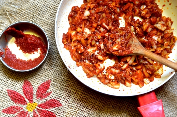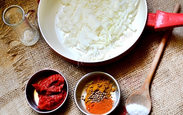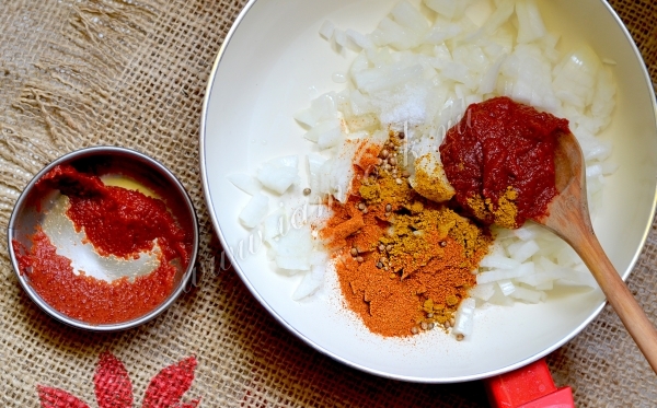 В сковородку налить 1 ст.л. растительного масла. Добавьте томат и специи.
