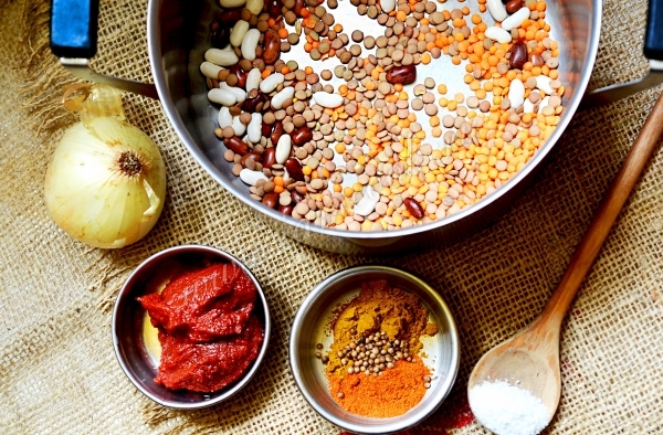 Итак, нам понадобятся следующие ингредиенты: Фасоль красная (быстроразваривающаяся), фасоль белая, чечевица разных сортов, печень куриная (лучше говяжья), лук, томатная паста, куркума, паприка, кориандр.