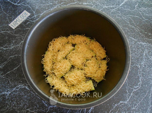 Посыпьте полоски кабачков тёртым сыром. Установите чашу на место. Запекайте кабачки в сыром в мультиварке в режиме "Выпечка" 20 минут. У меня мультиварка Redmond.