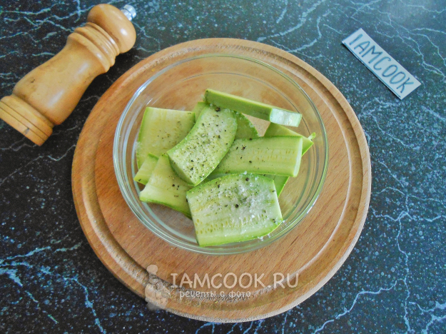 Сложите полоски кабачков в мисочку, посолите и поперчите. Лучше взять свежесмолотый чёрный перец, тогда блюдо будет ароматнее.