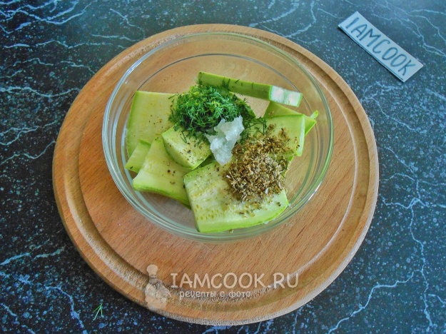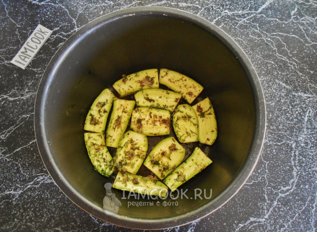 Смажьте дно чаши мультиварки подсолнечным маслом и уложите полоски кабачков в специях.