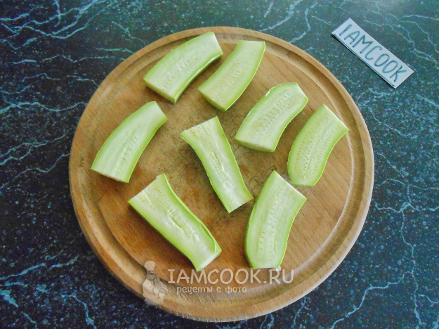 Молодые кабачки разрежьте поперёк на две равные части, затем разрежьте вдоль на две или три полоски. Толщина полосок должна быть не менее 1 см, в противном случае кабачки просто превратятся в кашу.