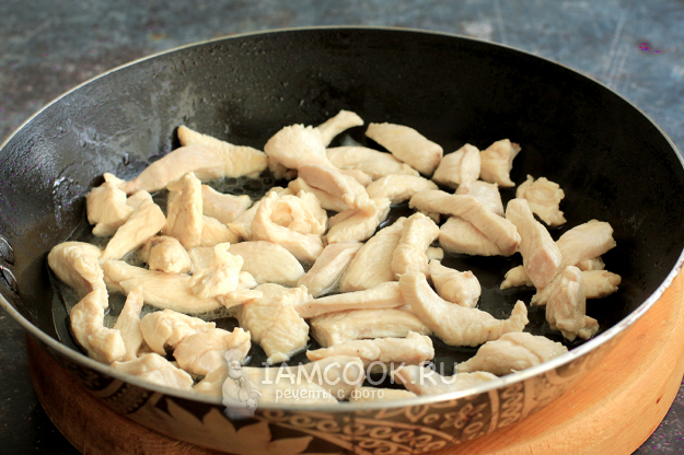 В растительном масле быстро обжарьте куриное филе, минут 5.