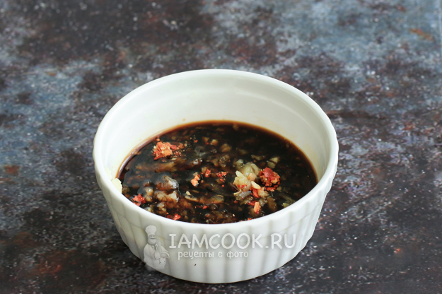 В соевый соус добавьте по вкусу острый перец, измельченный (ножом) имбирь и выдавите два зубчика чеснока. Размешайте до объединения.