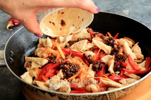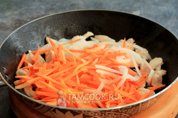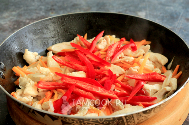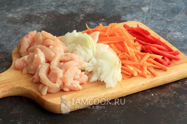 Перец, морковь и куриное филе нарежьте соломкой, лук - полукольцами.