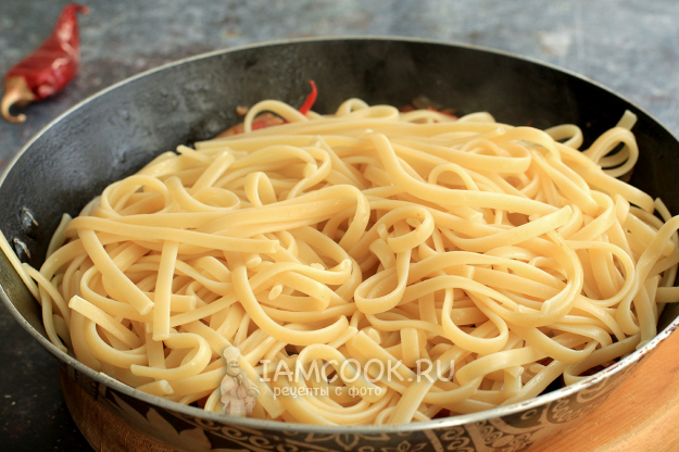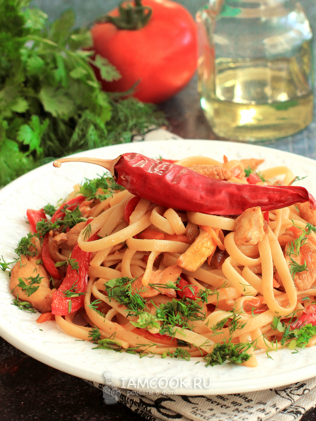 Лапшу отварите, как указано на упаковке, затем слейте воду и добавьте лапшу в сковороду с курицей и овощами. Перемешайте и прогрейте пару-тройку минут. Готовую лапшу с курицей и овощами посыпьте рубленой зеленью.