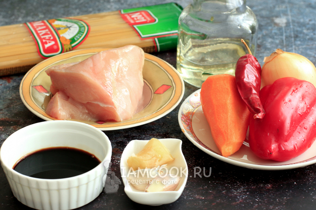 Для приготовления лапши с курицей и овощами нам потребуются следующие продукты. Имбирь предпочтительнее взять свежий, чтобы остался его вкус и аромат. Если соевый соус слишком насыщенный, то добавьте в него щепотку сахара. Я не добавляла соль в это блюдо, нам хватило соевого соуса, но вы обязательно пробуйте то, что готовите, и корректируйте вкус блюда.