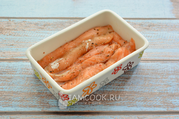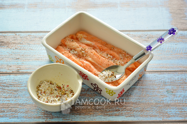 Складывайте в контейнер срезанное филе брюшек, пересыпая равномерно смесью соли, сахара и перца. Вы можете нарезать филе брюшек семги на более мелкие куски или оставить их длинными полосками.