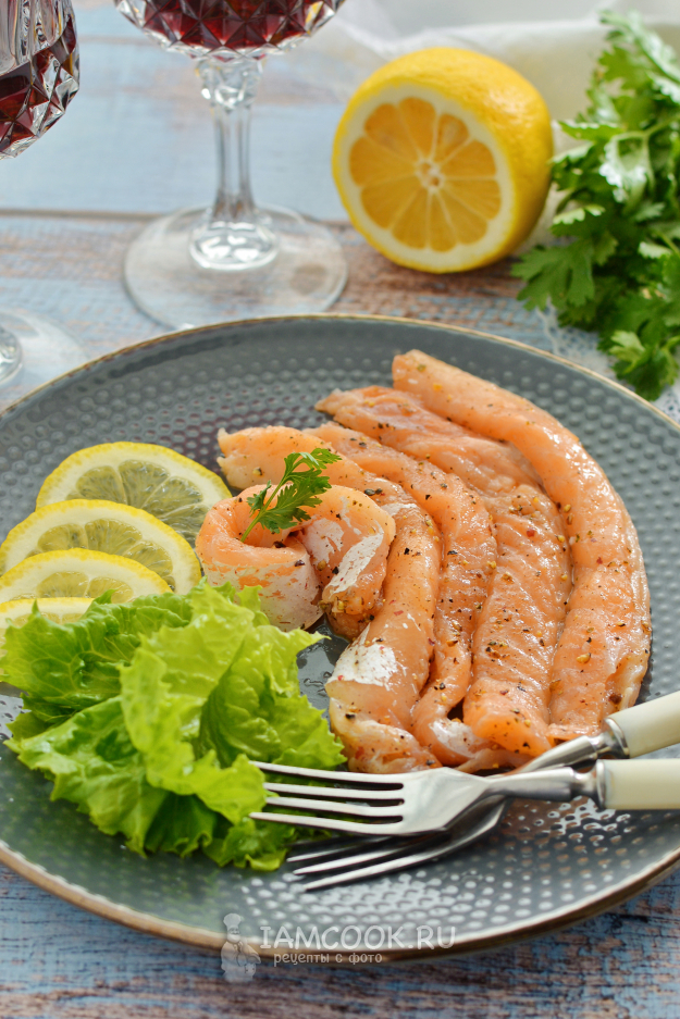 Контейнер накройте крышкой и уберите в холодильник на 12 часов. После засолки в контейнере может быть небольшое количество вытекшего сока и рыбьего жира, их нужно аккуратно слить.