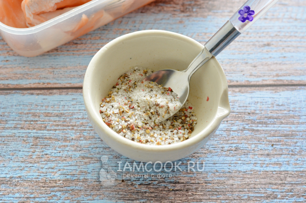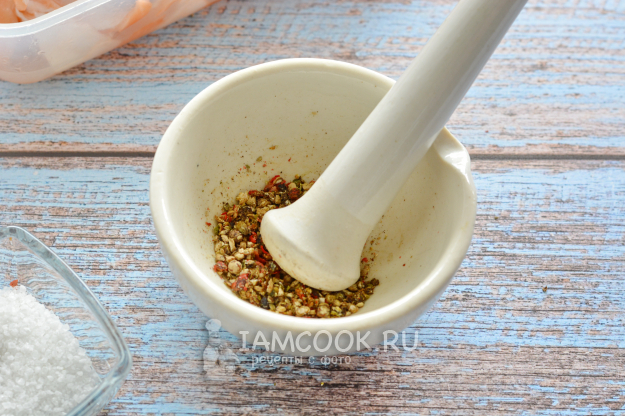 Смесь перцев горошком (черный, белый, розовый, зеленый) раздробите в ступке пестиком. Либо воспользуйтесь мельницей для перца.