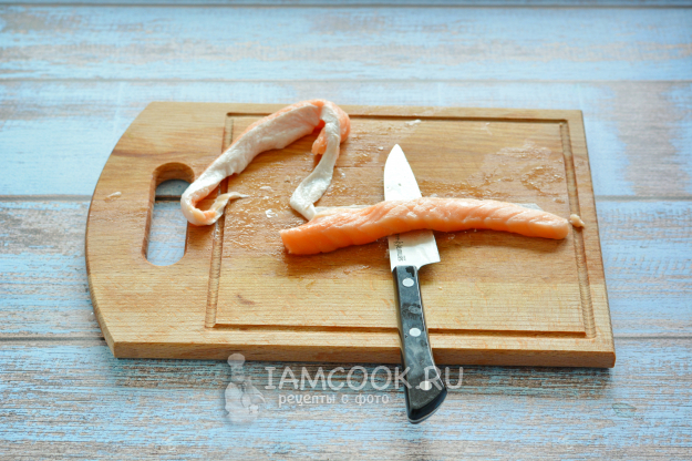 С брюшек семги срежьте филе. Оставшуюся шкурку и плавники можно использовать для приготовления рыбного бульона.