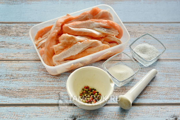 Подготовьте всё необходимое для засолки брюшек семги в домашних условиях. Если брюшки замороженные, то разморозьте их в пакете или контейнере с крышкой. Счистите с брюшек чешую. Ополосните под водой и обсушите на салфетке.
