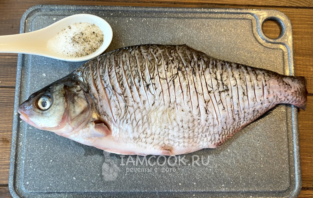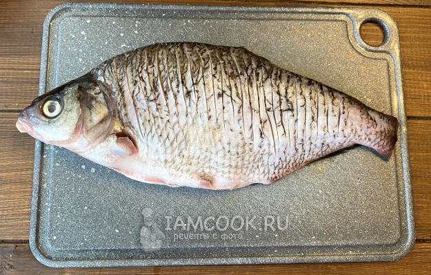 Рыбу очистите от чешуи, вспорите брюшко и удалите внутренности, срежьте плавники. По желанию срежьте голову или оставьте, но обязательно удалите жабры. Промойте под проточной водой, положите на разделочную доску и острым ножом сделайте частые надрезы до хребта (см. фото).
