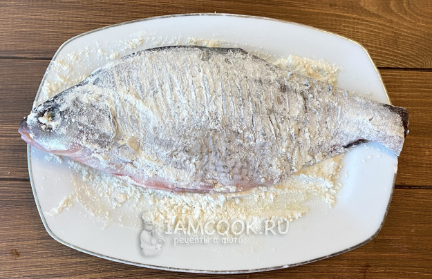 В тарелку насыпьте муку и обваляйте рыбу с двух сторон.