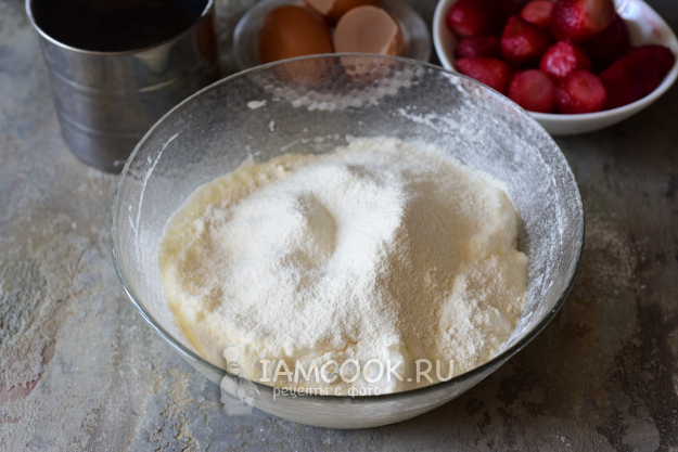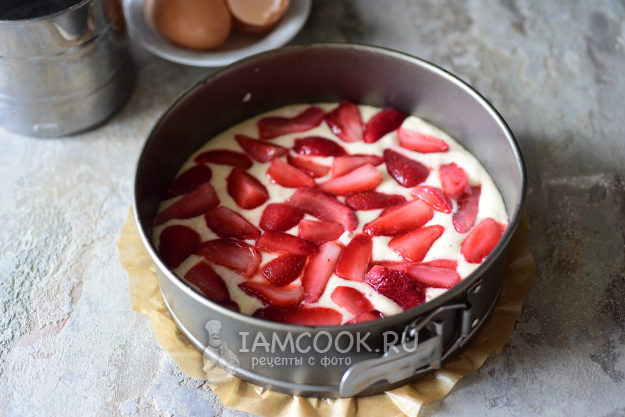 Форму для выпекания застелем пищевым пергаментом (желательно силиконизированным). На дно подготовленной формы выложим все тесто и сверху разложим клубнику, которую произвольно уже нарезали - я каждую ягоду разрезала продольно на четыре части. Выпекаем примерно 35 минут в уже разогретой к этому моменту до 180 градусов духовке.